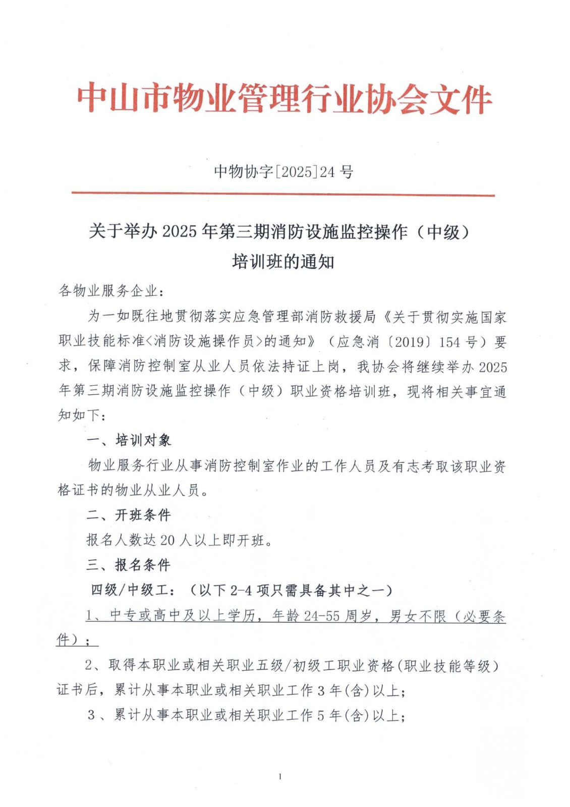 关于举办2025年第三期消防设施监控操作(中级)培训班的通知